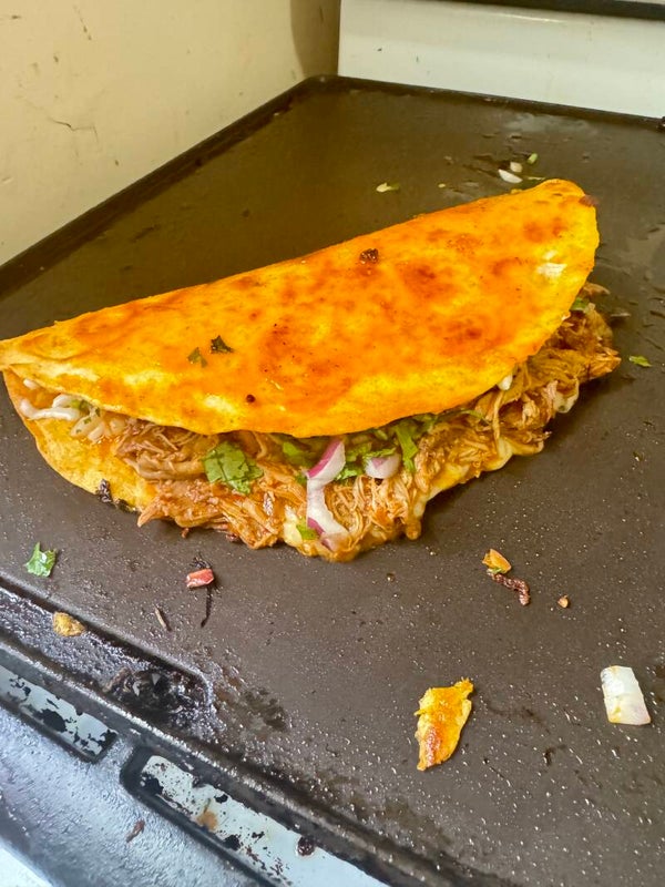 Large flour cheesy tortilla filled with your favorite birria meat or shrimp topped with cilantro and onions. Served with consomé, cucumbers, radish, lime wedge, verde. And don't forget the quesadilla toppings sour cream, pico de gallo and guacamole.
