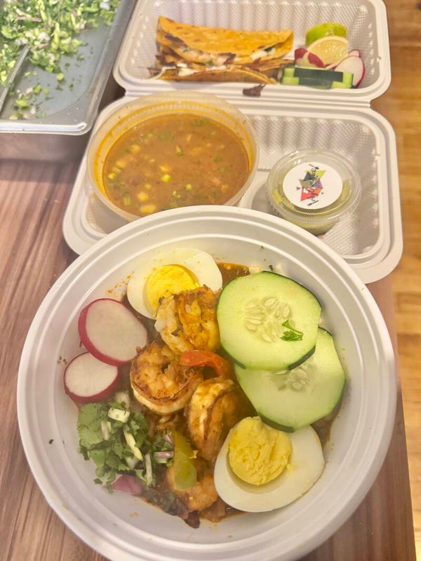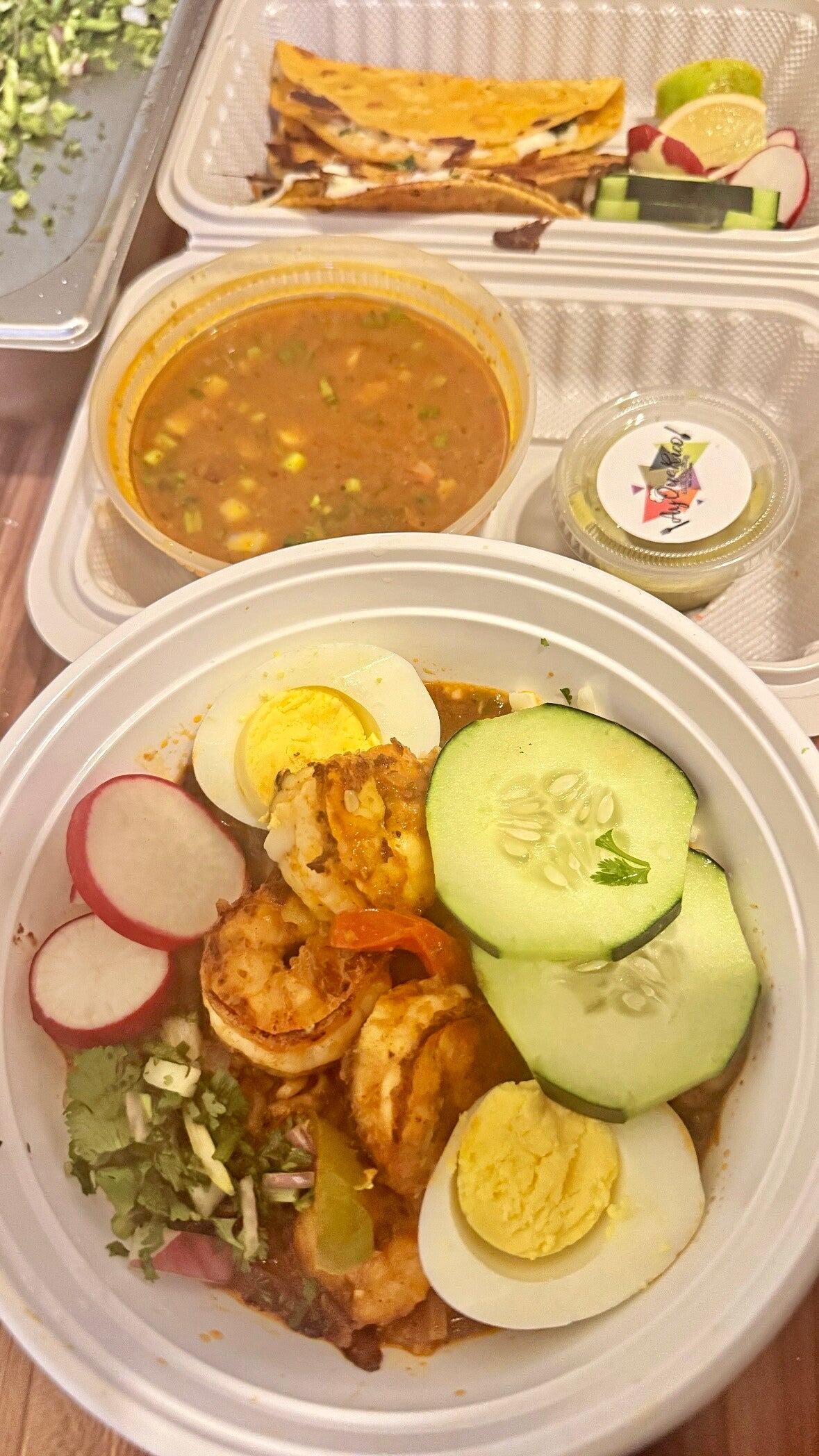 Ramen noodles topped with your choice of Beef,chicken or Shrimp mozzarella cheese, onions and cilantro and egg. Served with consomé, three crispy cheese tacos and cucumbers,radish, lime wedge and salsa verde
